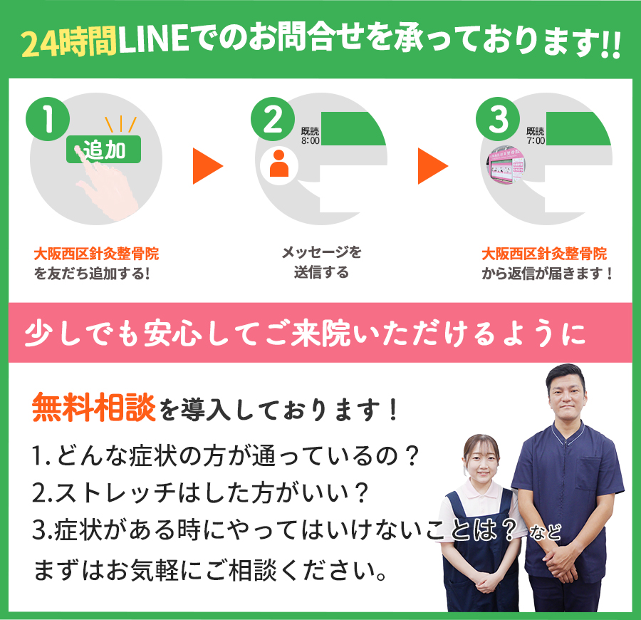 迷いなく「NO!」と即答できたのであれば、今すぐ「大阪西区針灸整骨院」へご連絡ください。