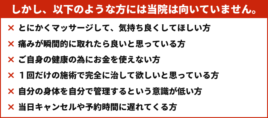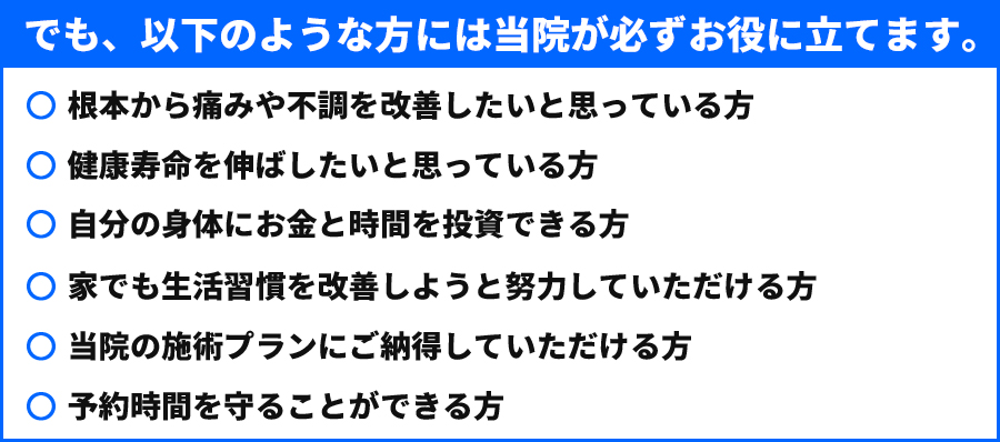 また、当院周辺にも多くの整体院や整骨院があり、その中でどこが自分の状態にあったところなのかを見極めるのは難しいことだと思います。
