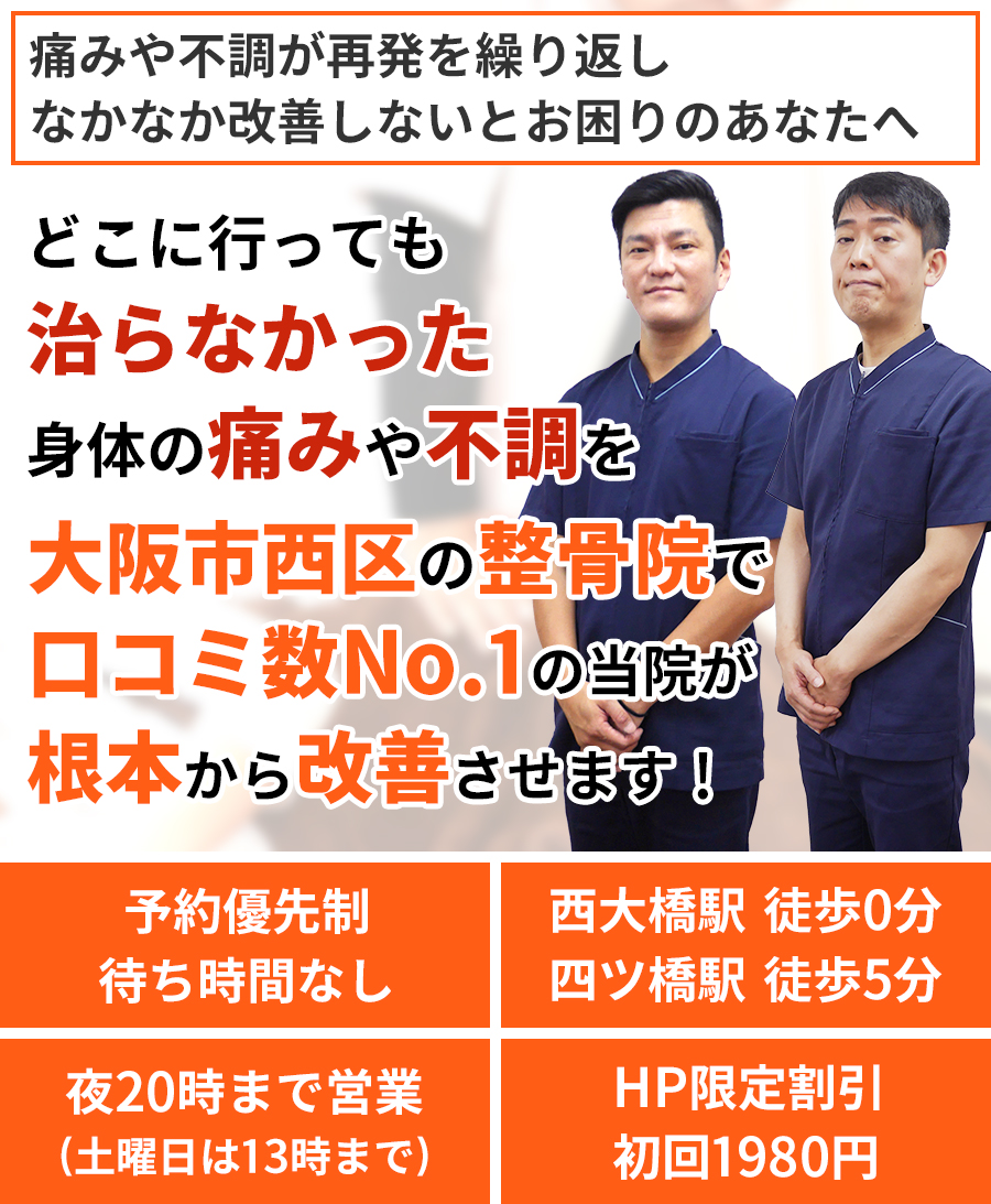 あなたがもし、今上記のようなお悩み、「ほんの少しでも心のどこかで良くなりたい!」と思われているなら、大阪西区針灸整骨院に来院し、「身体の痛みや不調」を根本改善しませんか?